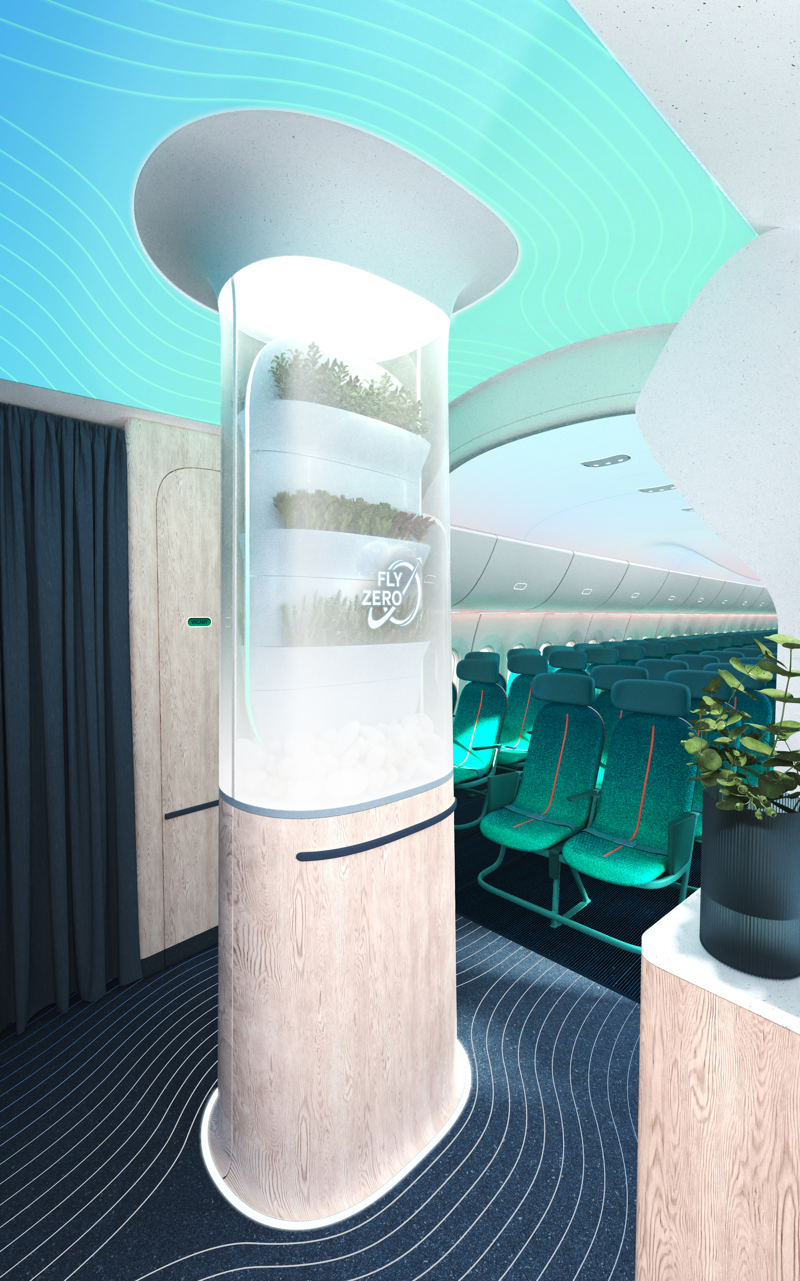 The midsize aircraft features large liquid filled hydrogen tanks which boasts a comfortable and flexible interior cabin arrangement. The subtly softened display ceiling provides a sense of calm whilst also providing functional information and feedback to passengers.